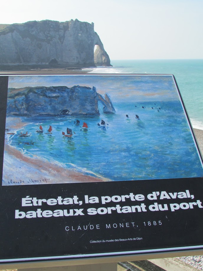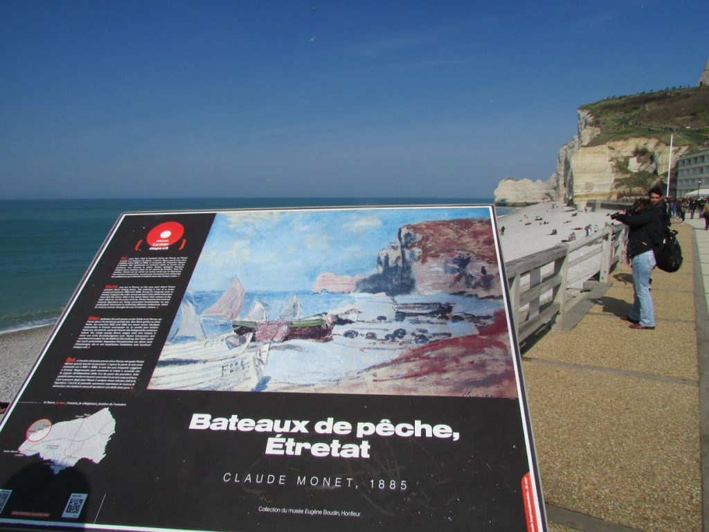 A beleza natural de Étretat chamou a atenção também dos pintores impressionistas, como por exemplo Eugène Boudin (1824-1898) e Claude Monet (1840-1926). Na orla da cidade, a prefeitura colocou placas com quadros na direção de onde foram, originalmente, pintados. Aí você compara a obra e a realidade.
